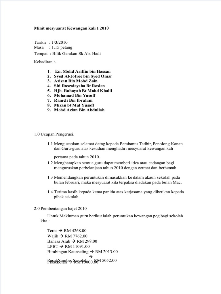 Minit Mesyuarat Kewangan Sekolah Pdf